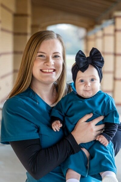 Even with her supportive family helping with the kids as much as possible, Cunningham said there were days where she had to take her newborn, Denver, to class. “They (the instructors and her fellow students) loved Denver like she was their own,” Cunningham said. “UACCB was super supportive and encouraging – the faculty and staff are amazing. Luckily, Denver is a super easy baby, so I would just carry all her stuff in with me. My classmates took turns holding her, especially when I needed to write notes, and let her sleep in their arms. When we all needed to take notes, Denver would sleep in her carrier. She became the nursing school mascot, she even has her own pair of scrubs.”