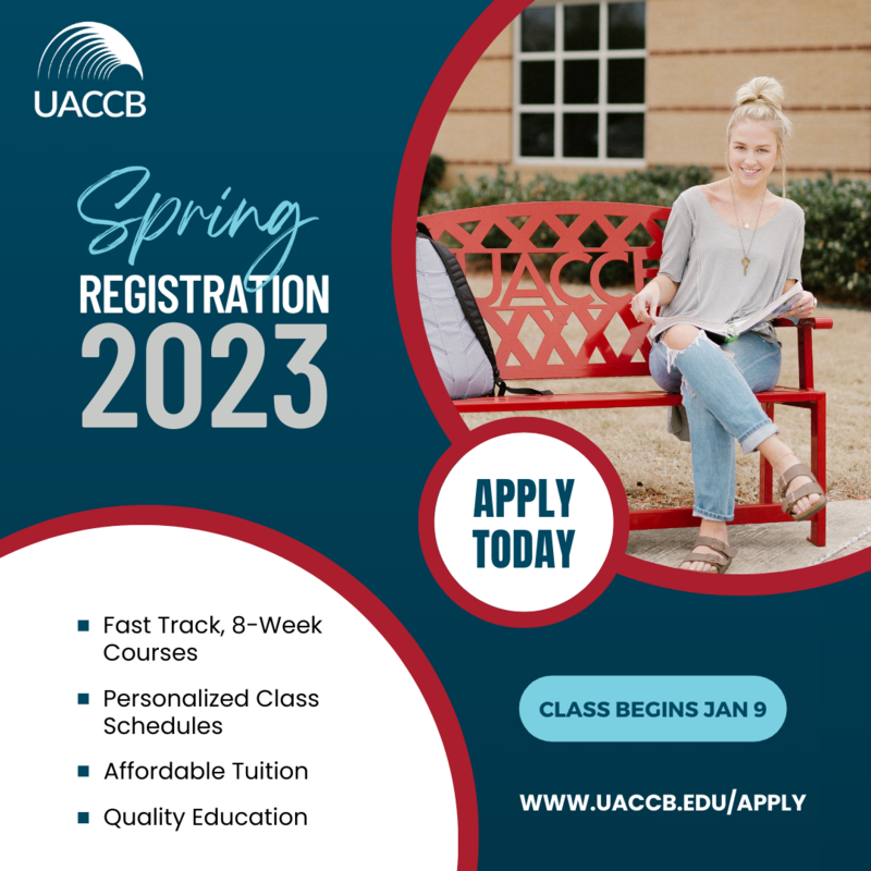 Registration for the spring 2023 semester at the University of Arkansas Community College at Batesville opens Wednesday, November 9, 2022, for new and readmitted students. Spring semester classes begin Jan. 9, 2023. The college also offers eight-week fast track courses that begin on Jan. 9 and March 8. Students can meet with an advisor to create their personalized schedule to meet their lifestyle and educational goals. To schedule an appointment, email advising@uaccb.edu. Those interested in attending UACCB in the spring can apply at uaccb.edu/apply. A variety of financial aid is available to assist students in paying for college.